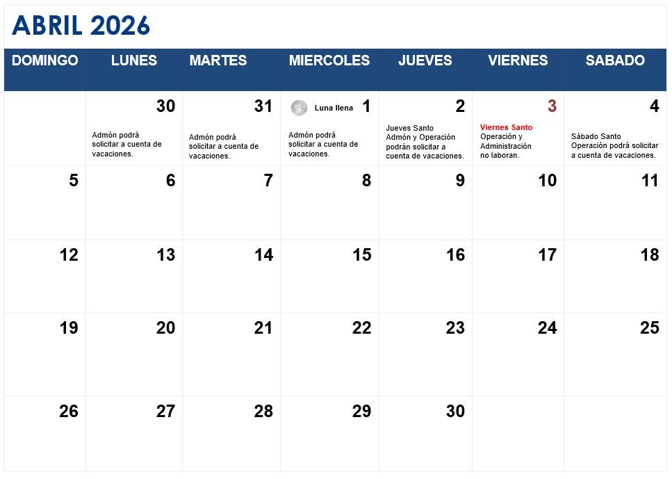 CALENDARIO LABORAL ABRIL 2026